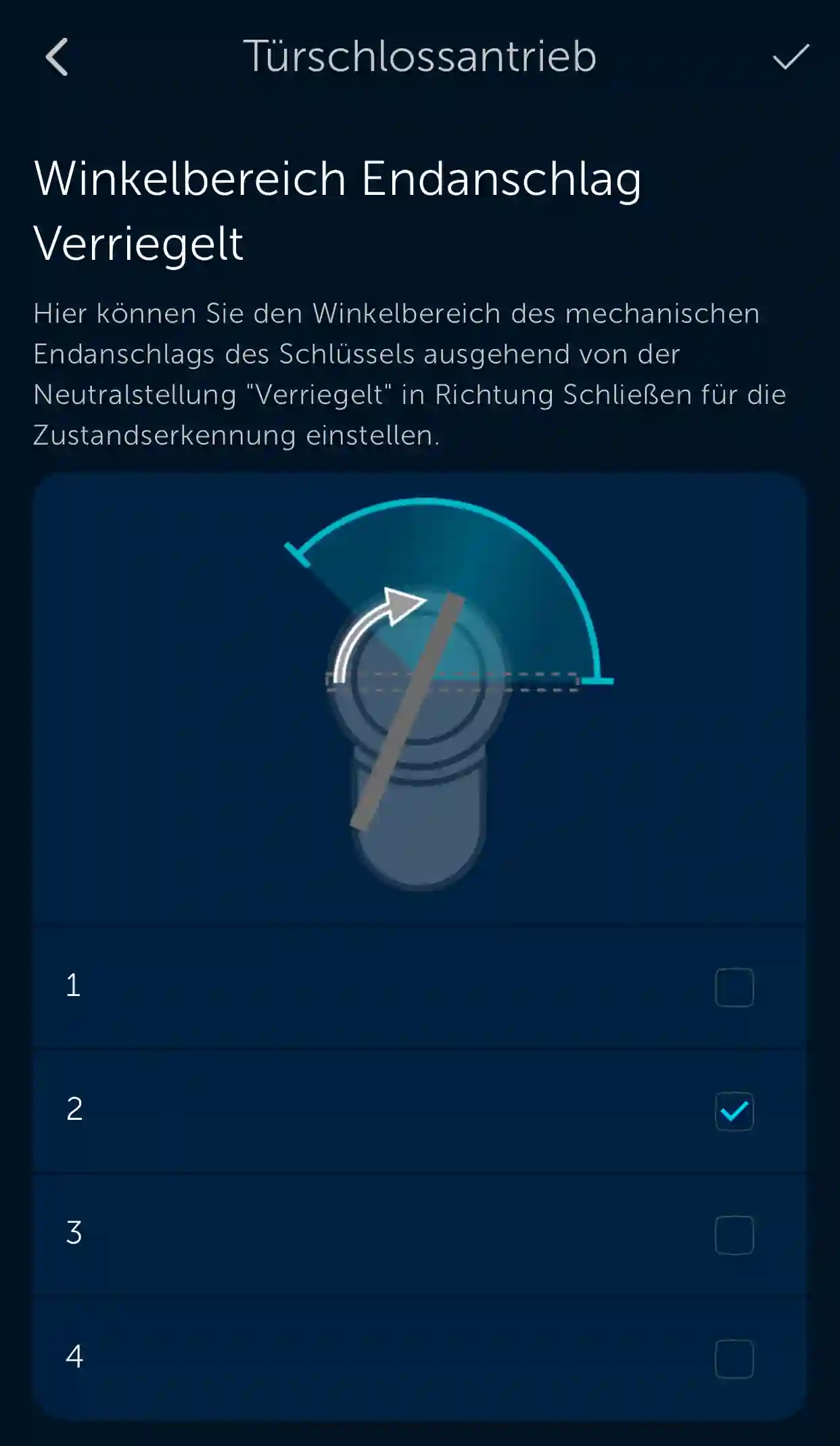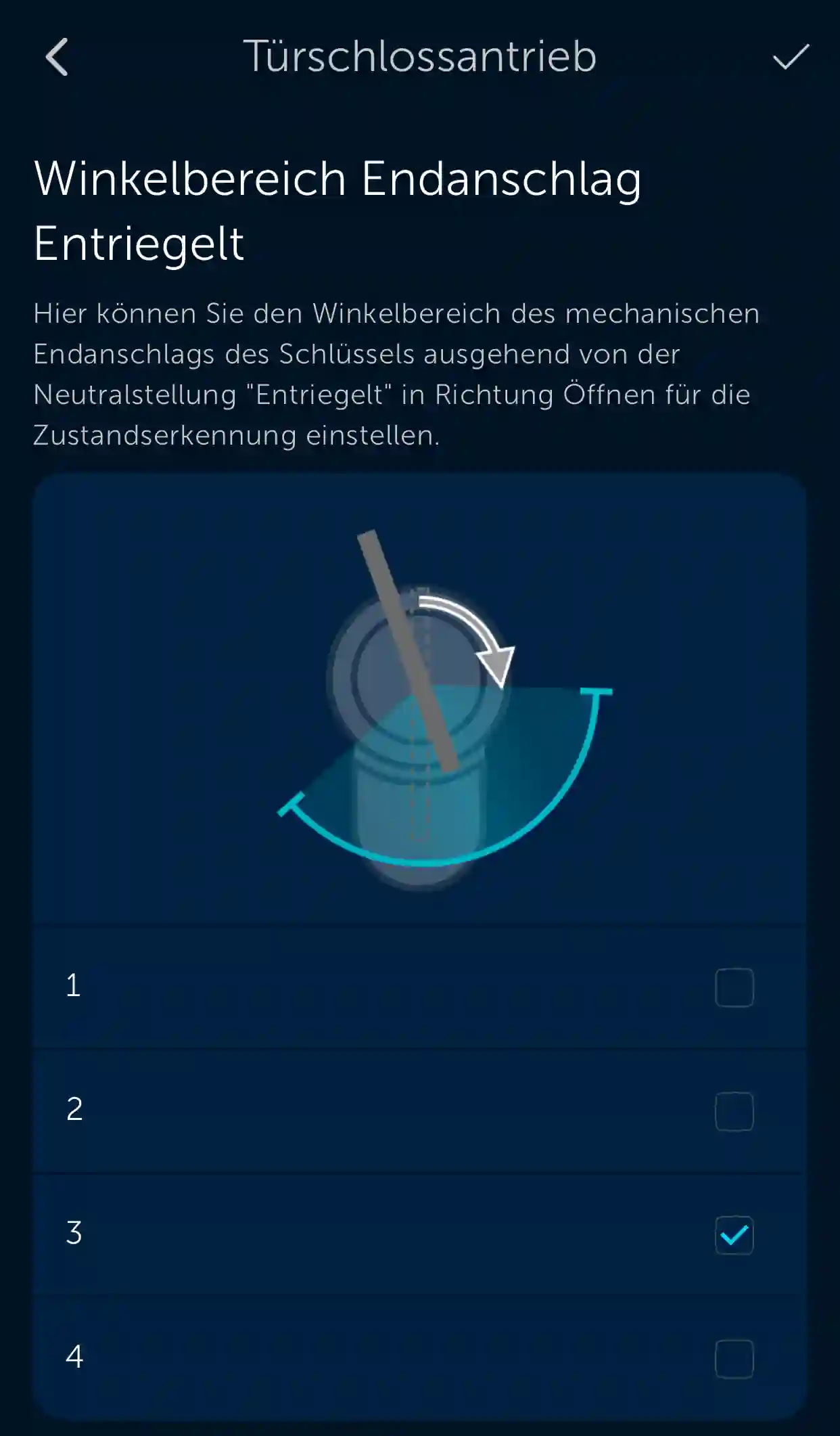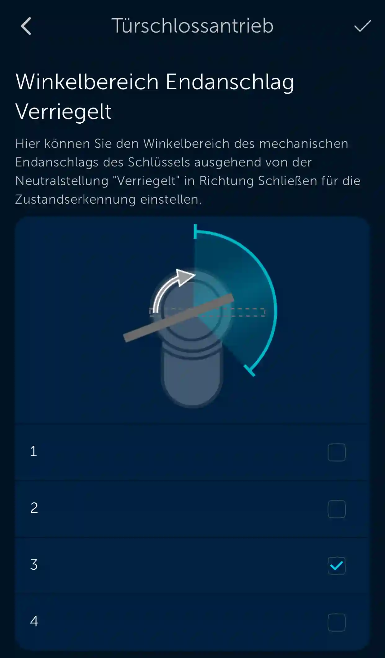 Damit dies funktioniert müssen wir die “Drehrichtung zum Verriegeln”, also die Position des Türgriffs auf rechts oder links einstellen. Ebenso muss die Anzahl der Umdrehungen zum Verriegeln und Neutrale Position festgelegt werden.