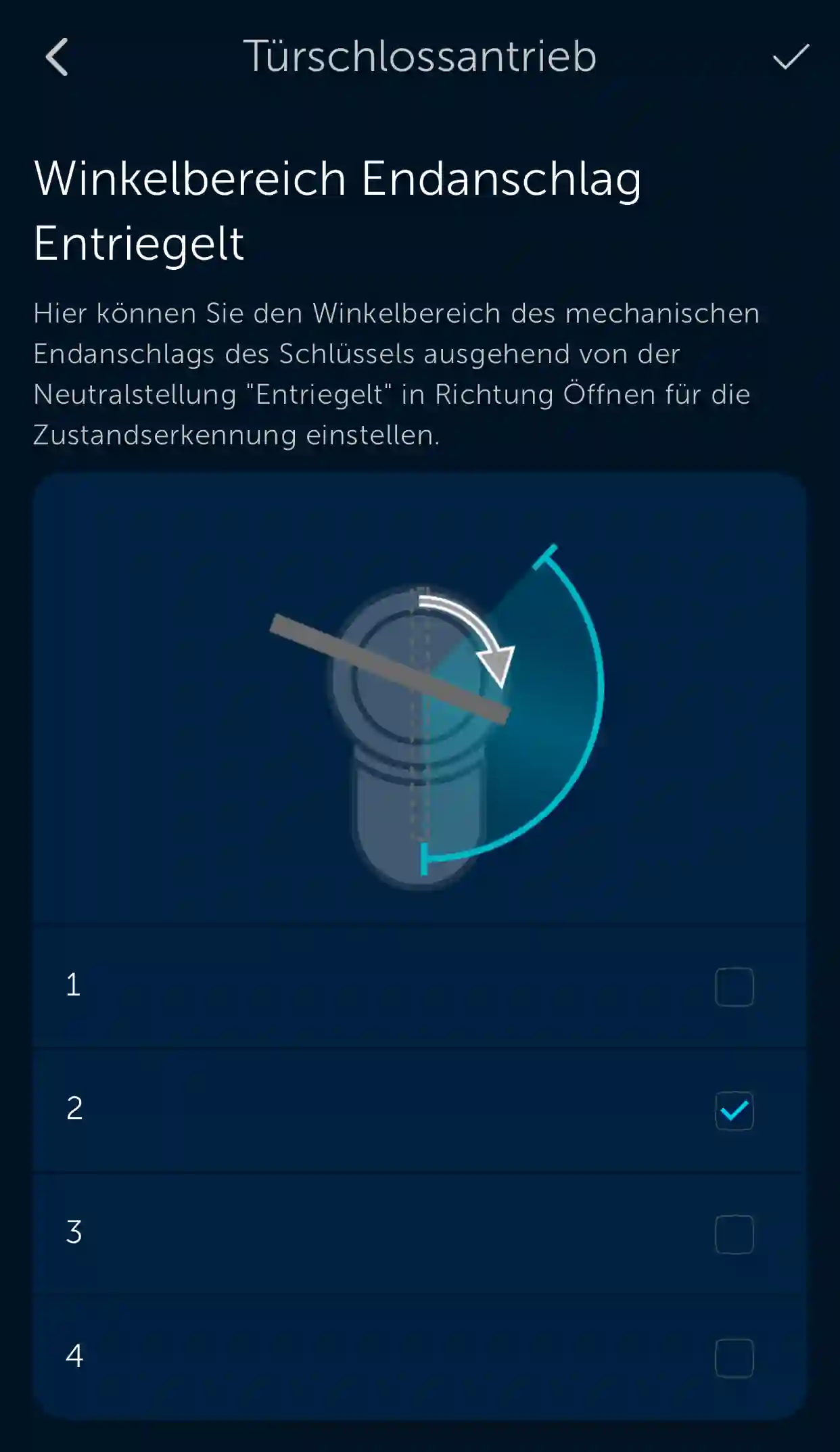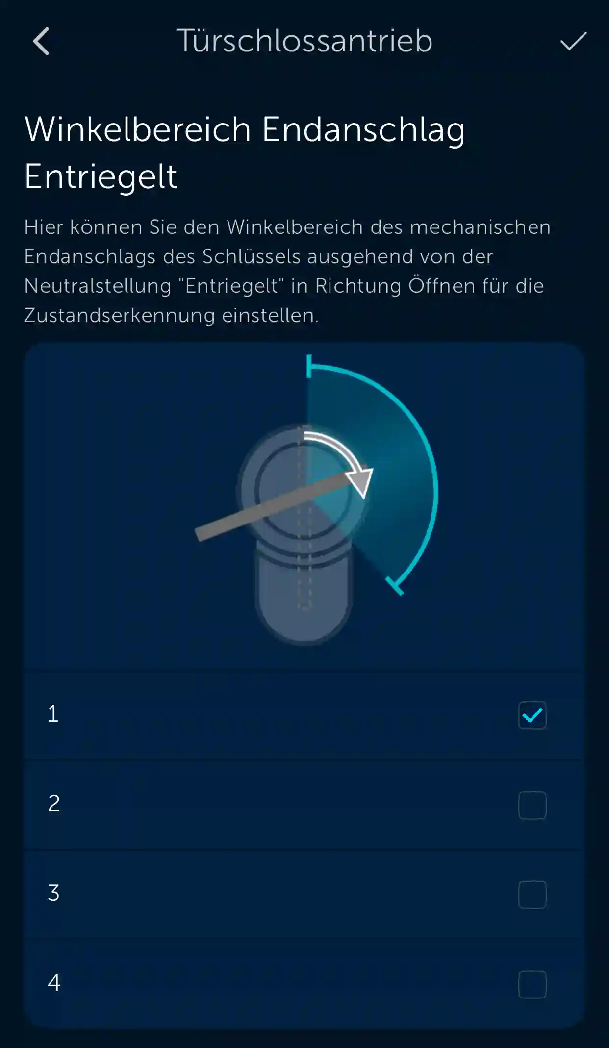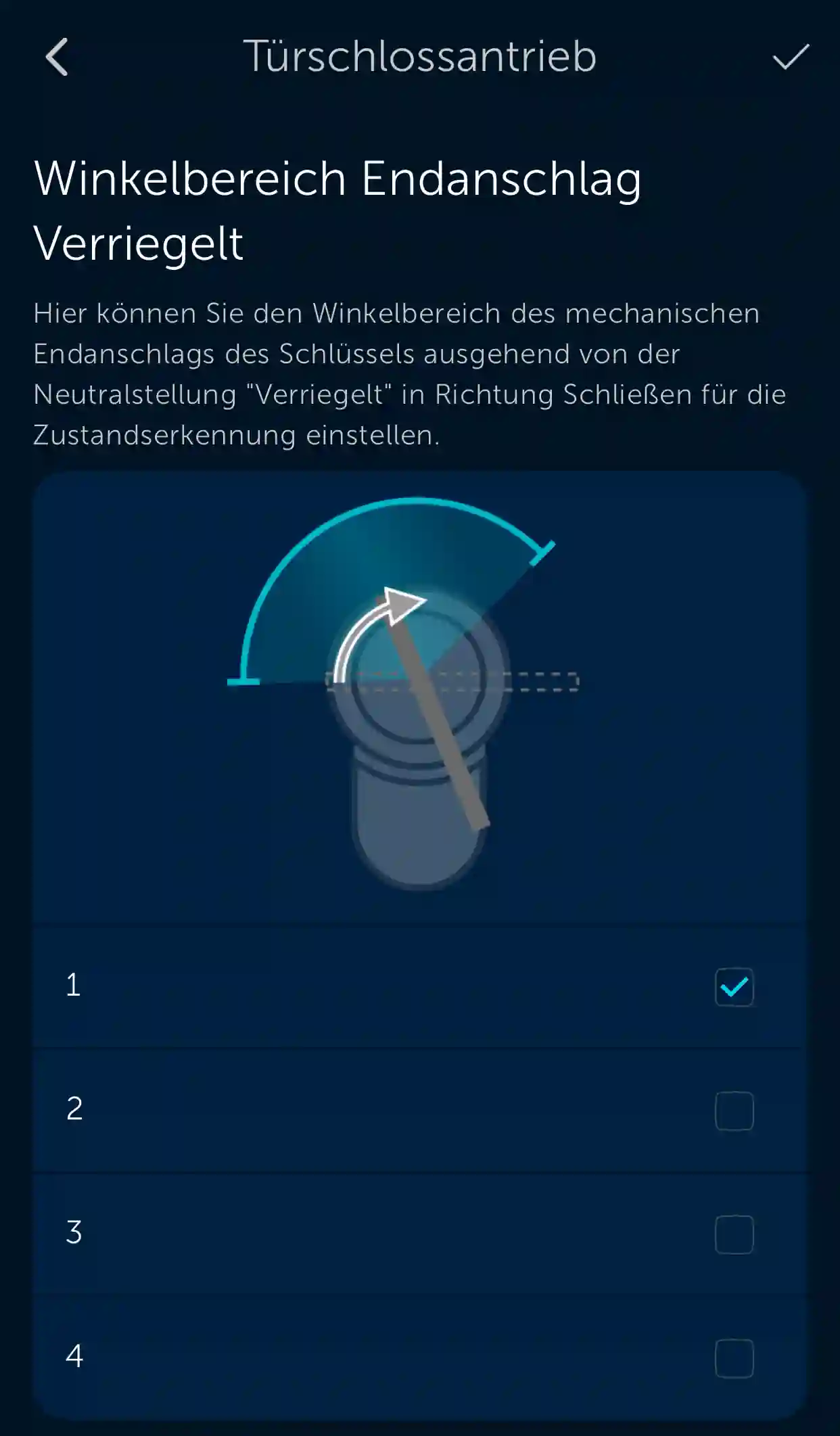 Damit dies funktioniert müssen wir die “Drehrichtung zum Verriegeln”, also die Position des Türgriffs auf rechts oder links einstellen. Ebenso muss die Anzahl der Umdrehungen zum Verriegeln und Neutrale Position festgelegt werden.